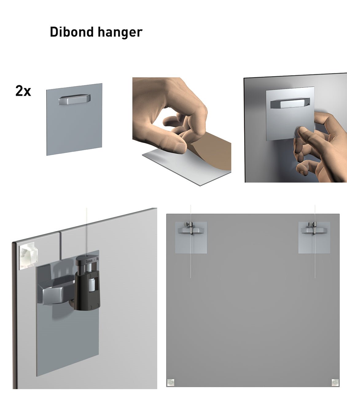 The Dibond Hanger is a self-adhesive hook made of galvanised steel, designed to be mounted on the back of a Dibond, Forex, or Plexiglas panel for easy and secure hanging. It is an accessory intended for use behind the panel and is available in several sizes: